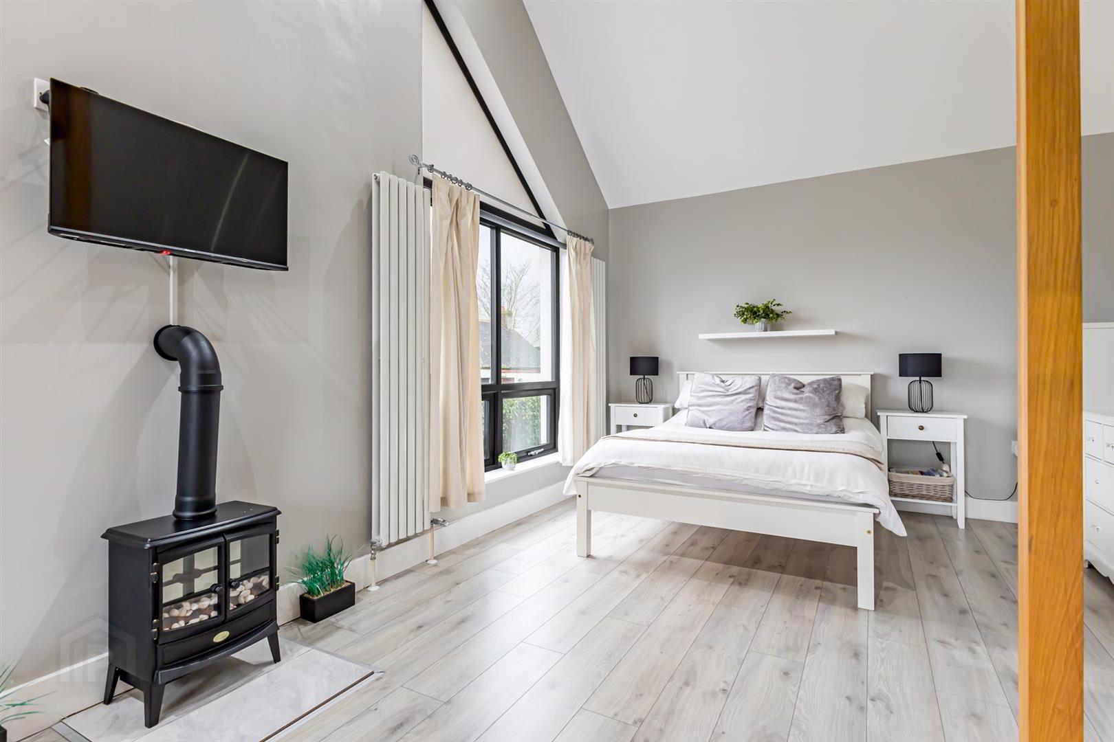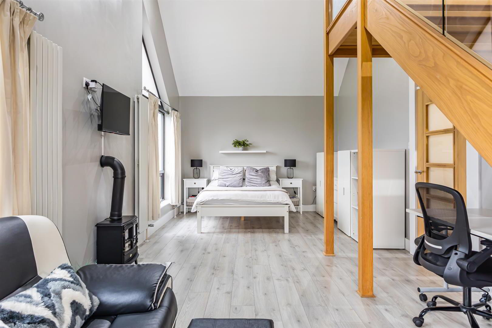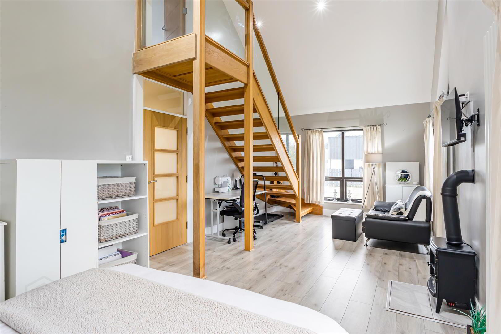 - Large bedroom suite with double height vaulted ceiling. Wood laminate flooring. 4 double vertical radiators and multi fuel stove. Living area and staircase to area above.