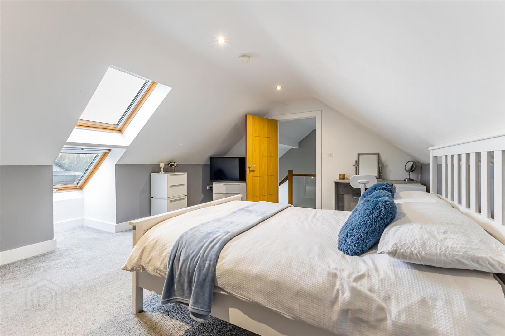 - Large bedroom with grey carpeted floor, spotlighting, velux windows and double radiator.