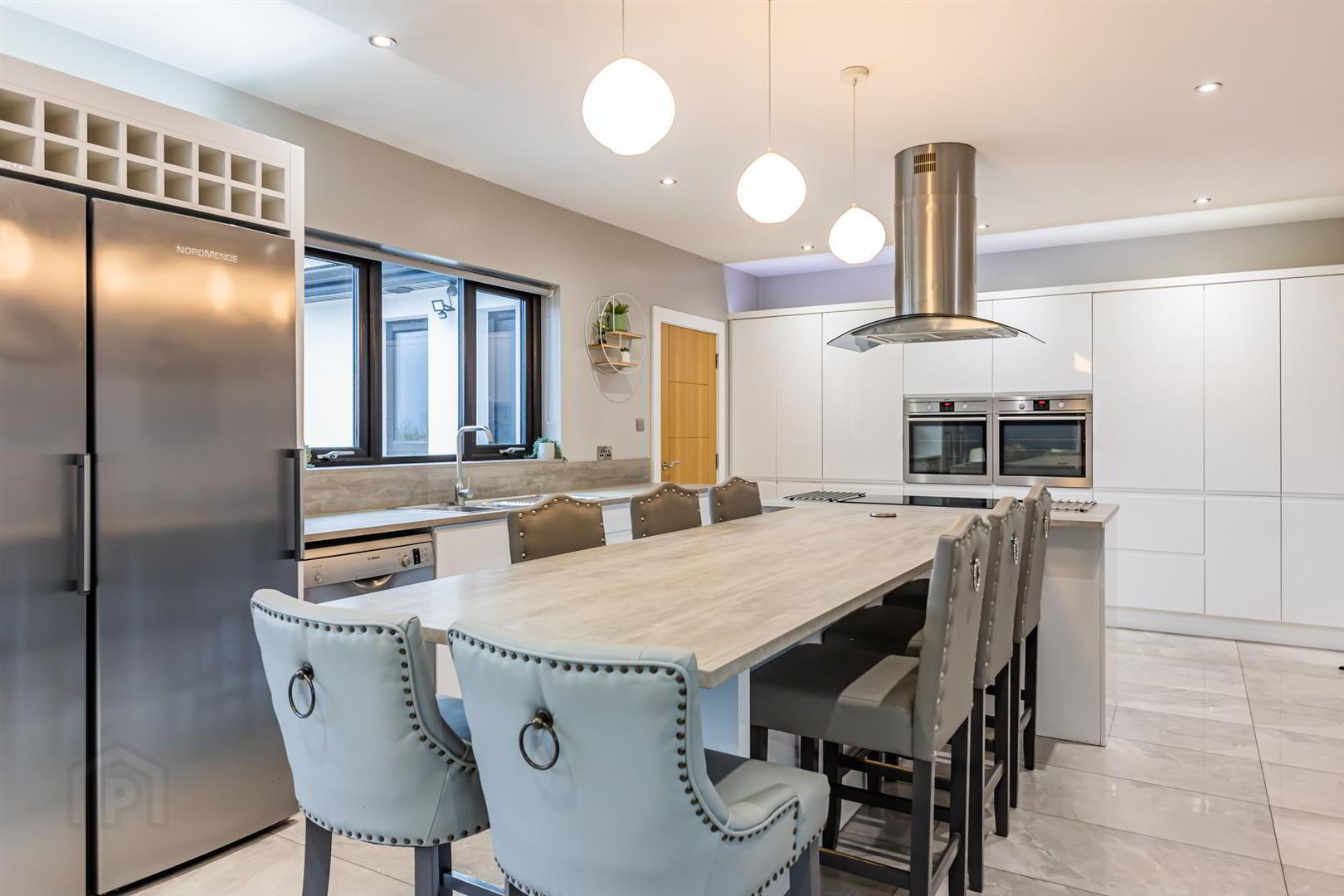 - Range of high and low level white handleless units with high gloss tiled floor and spotlighting, Large kitchen island with pendant lighting over island and pop up integrated socket. Grey quartz worktops, upstand and kitchen windowsill. Double eye level ovens , induction hob, full size fridge and freezer, dishwasher, and stainless steel extractor fan over island. Winerack above fridge and freezer. Double radiator and wall mount for TV.