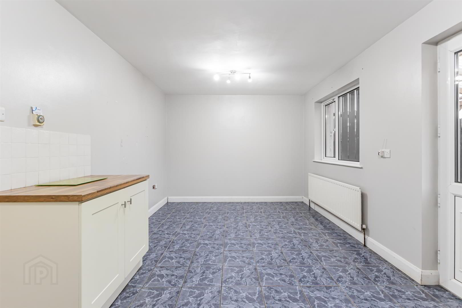 Spacious kitchen area with a range of high and low level cream units and tiled floor. Wood effect worktops with upstands and white tiled splashback. Stainless steel extractor hood with stainless steel sink and drainer with mixer tap. uPVC door to back garden and tiled floor.
