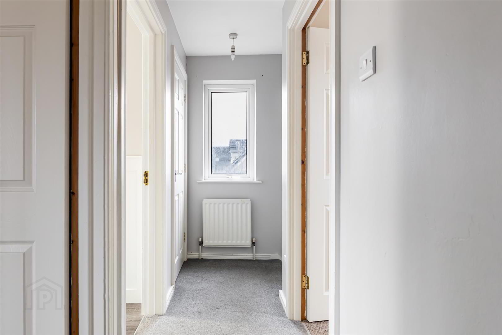 Grey carpeted flooring with small feature window at top of stairs. Double radiator and attic access.