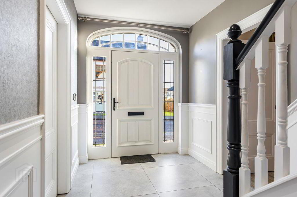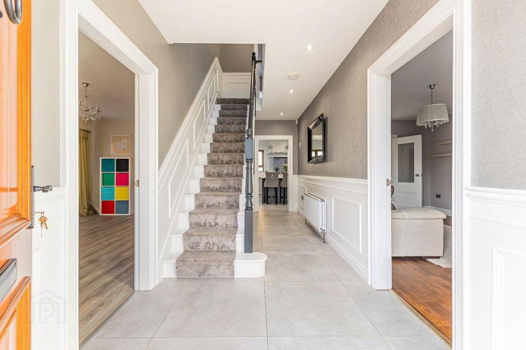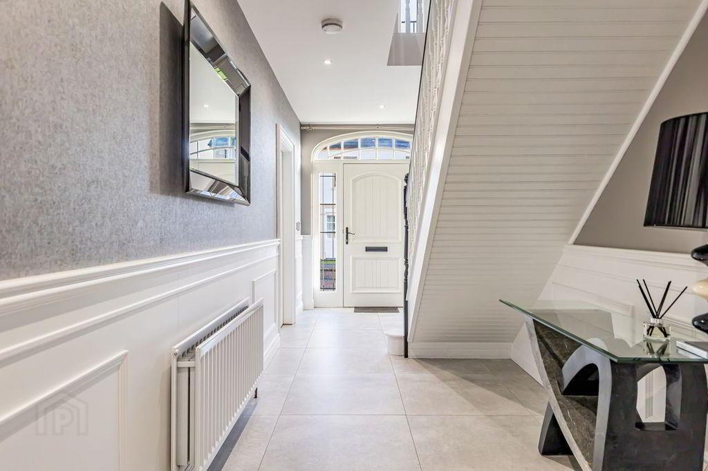 - A bright, airy and beautifully decorated entrance. Glazed front door surround, neutral tiled floor, white panelling to walls, painted staircase with grey carpet runner and double radiator.