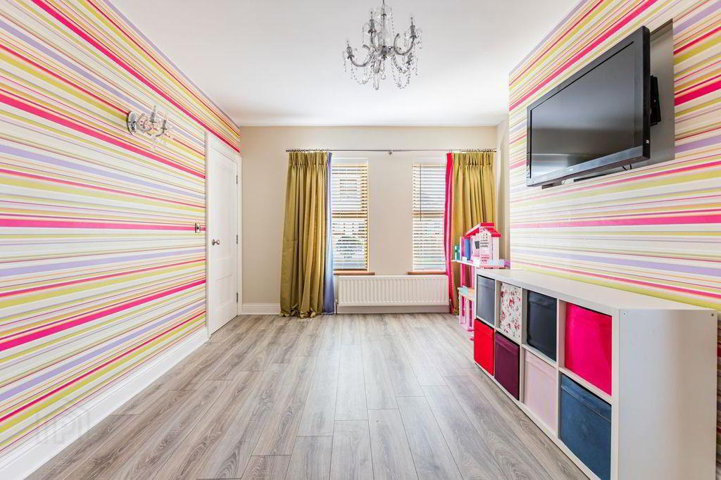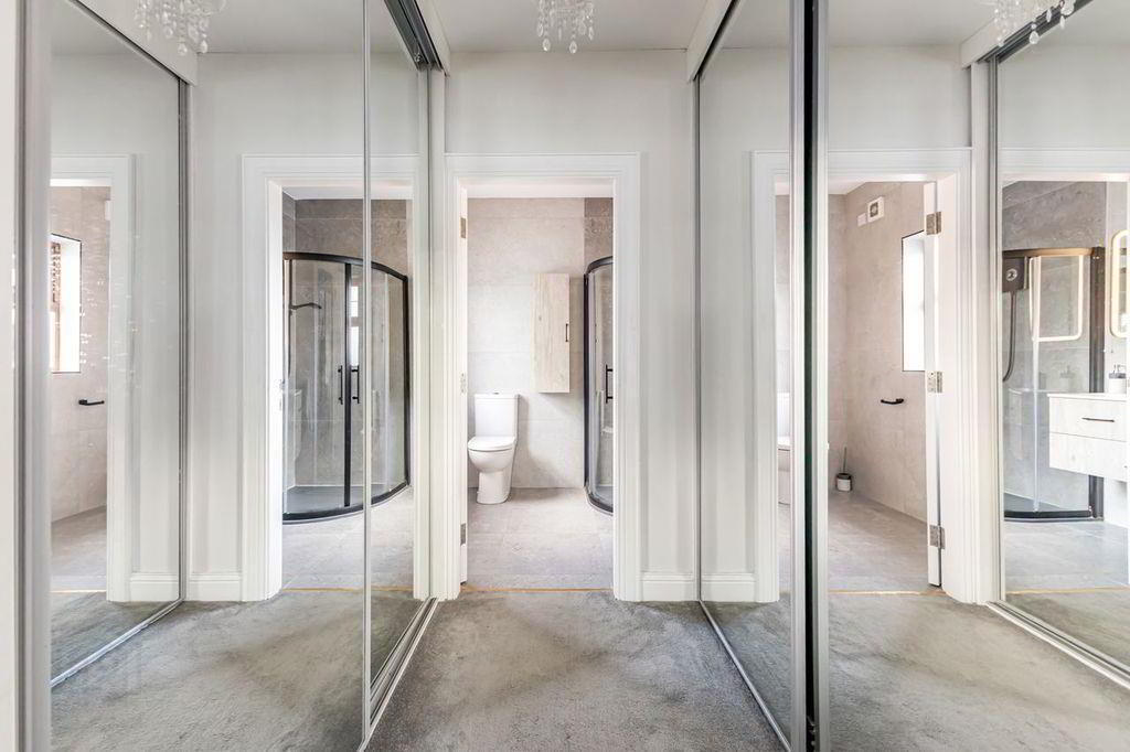 - Large bright bedroom with double windows to front and single window to the side. Feature wallpaper. Dressing room off master suite with floor to ceiling mirrored sliding wardrobes. Neutral grey carpet. Double radiator.