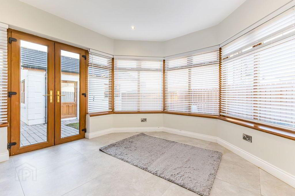 - Hexagonal shaped sunroom with double glazed doors from kitchen/dining area and French patio doors leading to outside area. Neutral tiled floor continues in from kitchen area, spotlighting, horizontal blinds, double sockets and double radiator.