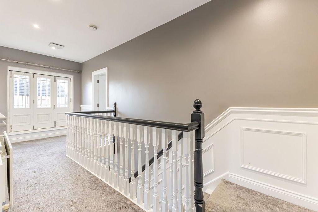 - Bright landing area with feature door that leads to Juliet balcony. Painted staircase and white painted half panelling. Neutral grey carpet and double radiator. Large hotpress.