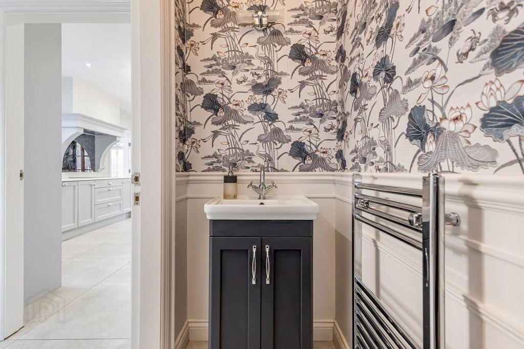 - Half panelling with feature wallpaper, co-ordinating sink unit and chrome towel rail.