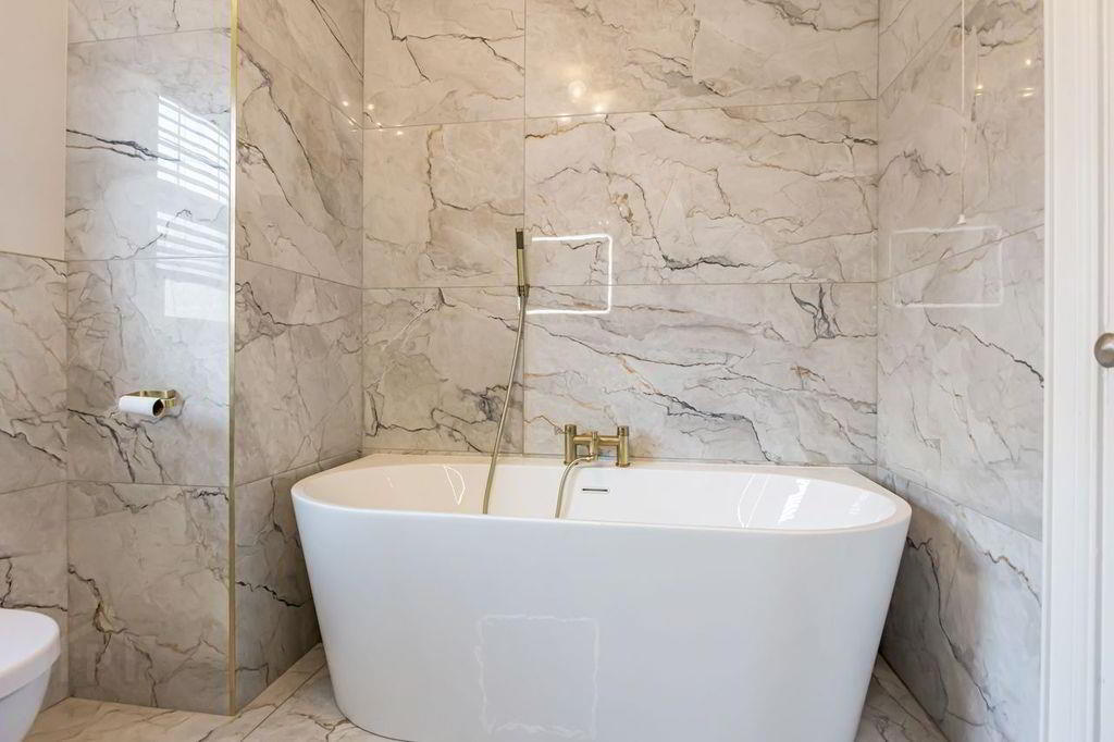 - White WC and freestanding bath with shower attachment. Marble effect tiles floor to ceiling and on floor. Rainfall and handheld showerheads. Gold coloured sanitary fittings and heated towel rail. Illuminated over sink mirror. Under sink storage in contrasting navy colour.