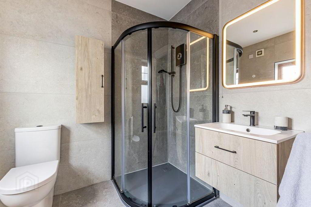 - Part of the master suite, leads off the dressing room. Matte neutral floor to ceiling tiles. Black sanitary fittings and white WC, black electric shower fitting and grey shower tray. Under-sink and wall storage. Illuminated mirror over sink. Black heated towel rail.