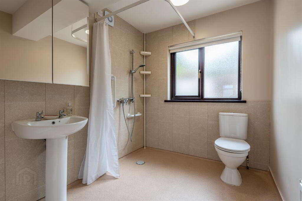 Wetroom style shower area with white pedestal sink, WC and built in storage cupboard.