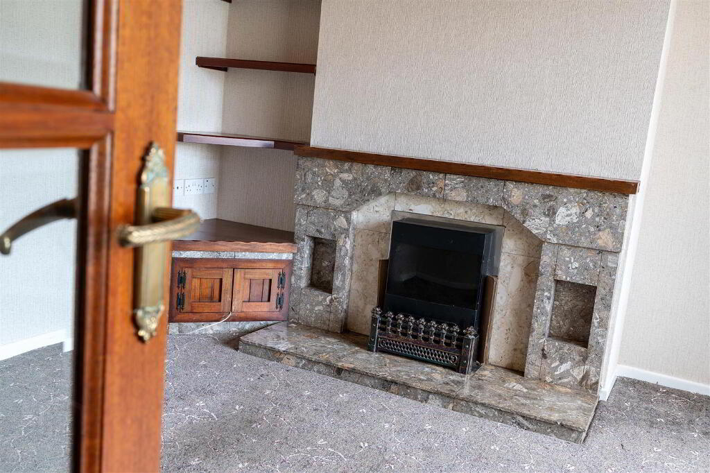 A bright and spacious living area with tiled fireplace with electric inset, carpeted flooring, double radiator & built in TV unit with TV sockets.