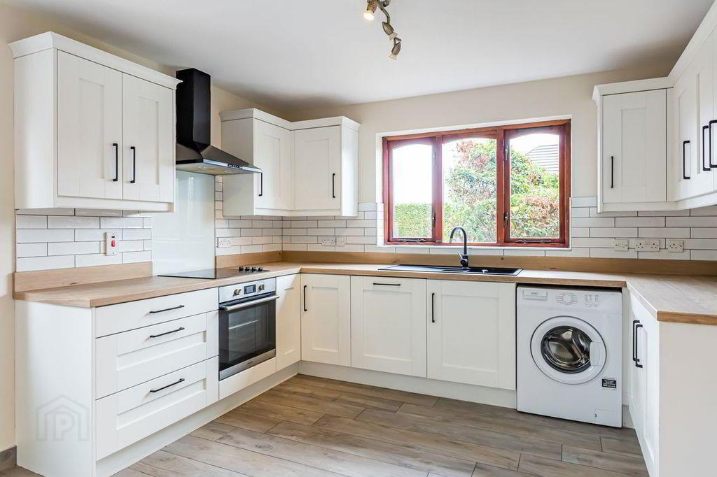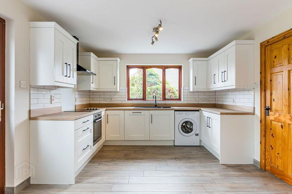 A range of high and low level modern white units, with wood effect worktop and upstands. White subway tiles to splashback and black sink. Appliances include dishwasher, oven and induction hob. Wood effect tiled floor and skirting.