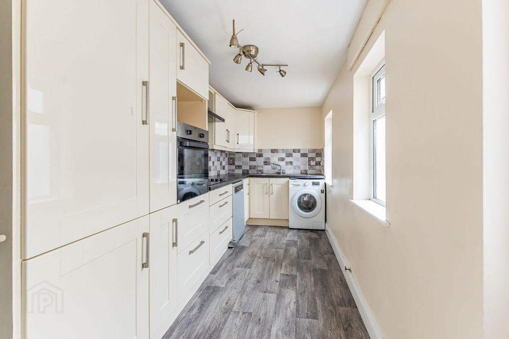 Range of high and low level cream kitchen units with oven, induction hob and dishwasher. Grey wood effect floor and subway tile splashback