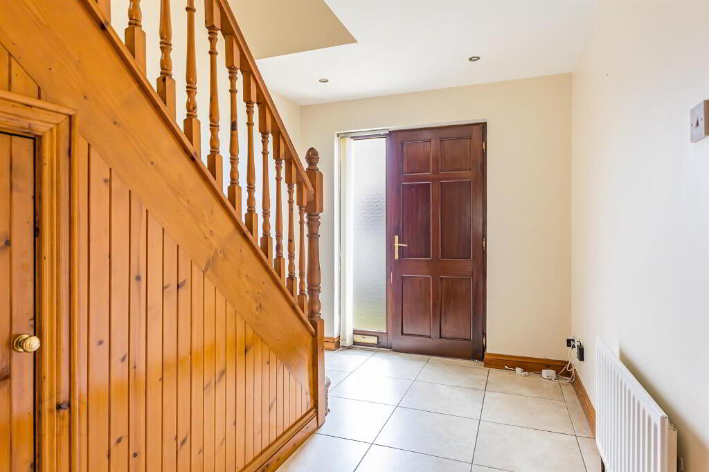 Airy entrance hall, wooden staircase with under stair storage. Neutral floor tiles and single radiator.