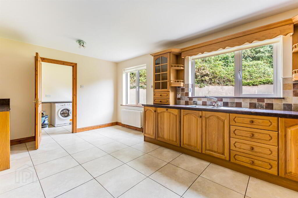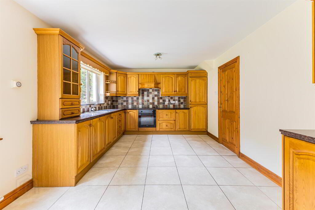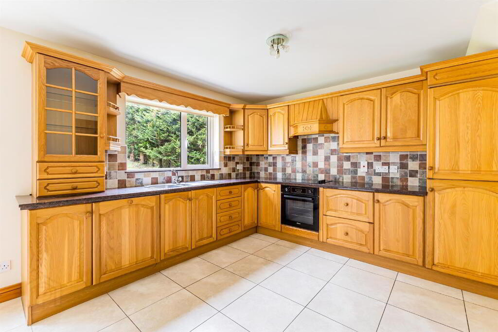 A range of high and low level solid wood units with granite worktop and granite kitchen windowsill. Glass display units and wine rack. Tiled splashback. Oven with induction hob, extractor fan and integrated dishwasher. Room for freestanding fridge freezer. Double radiator