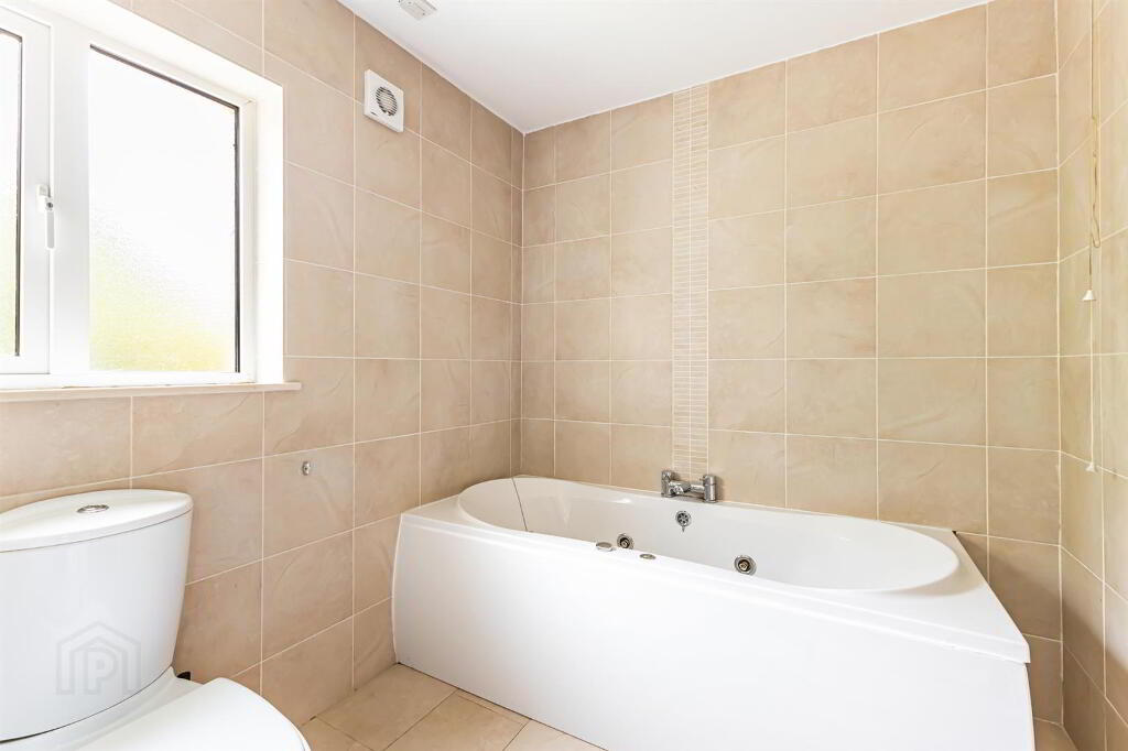 Main bathroom with modern white sanitary ware and whirlpool bath. Fully tiled with a neutral tile. Electric shower and single radiator.