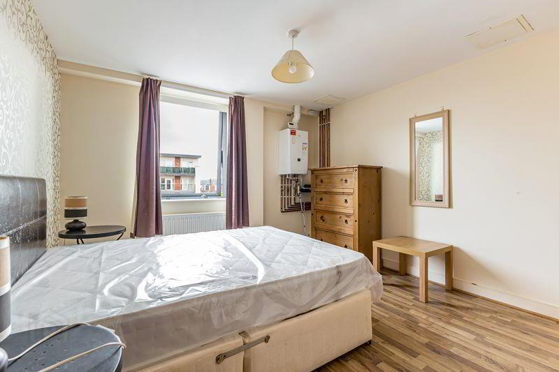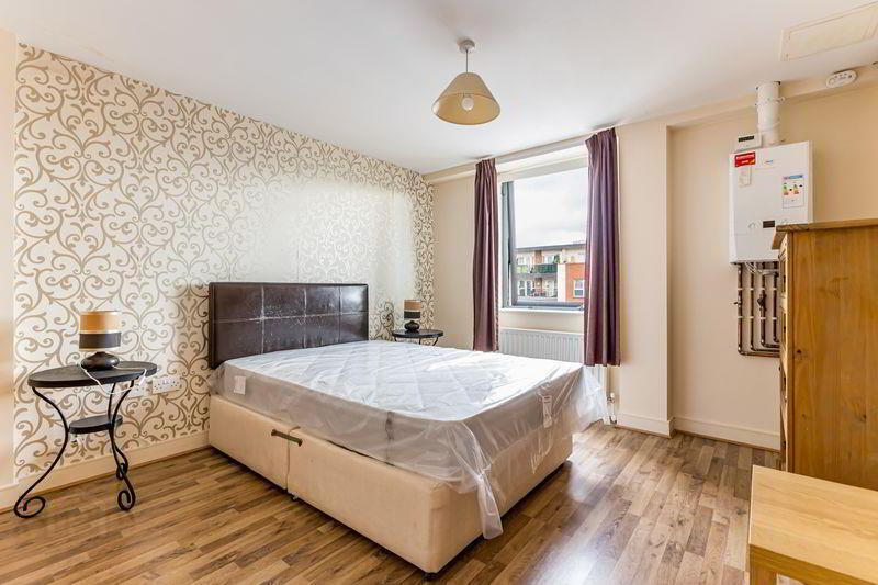 Large double bedroom with built in storage space and single radiator. Laminate wood flooring.