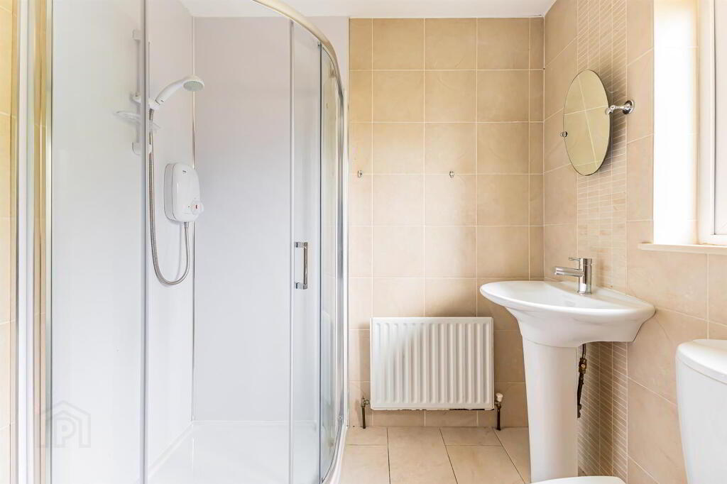 Fully tiled with a neutral tile. Electric shower and white sanitary ware.