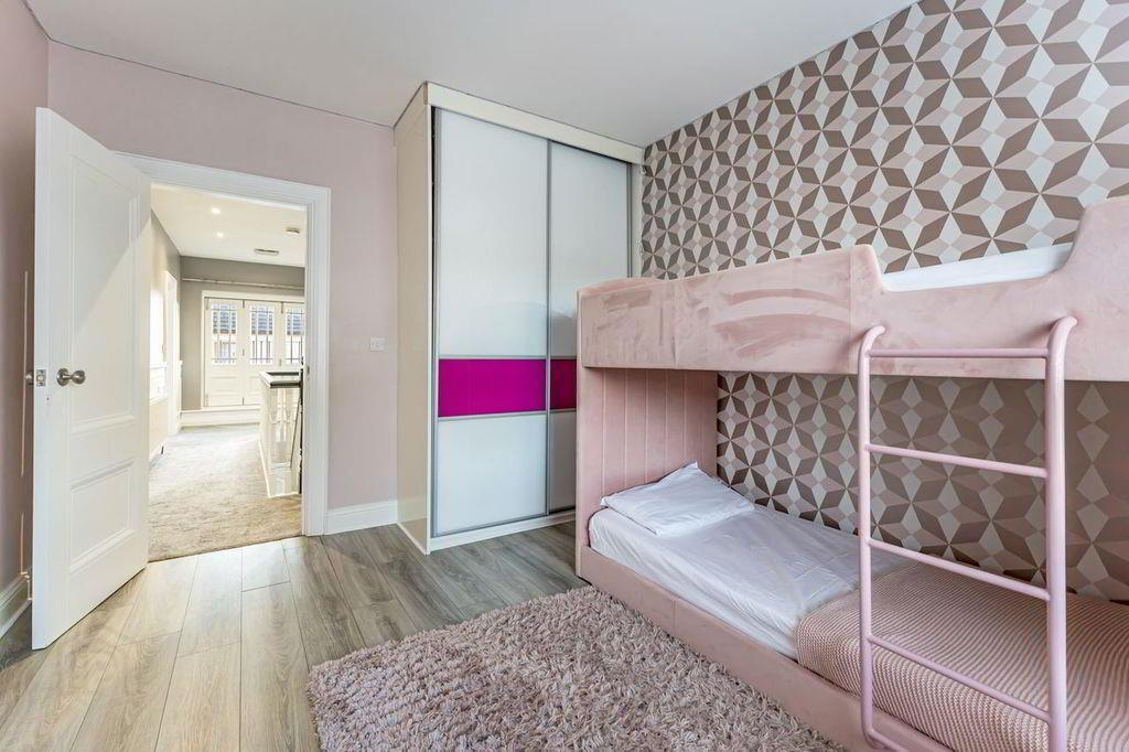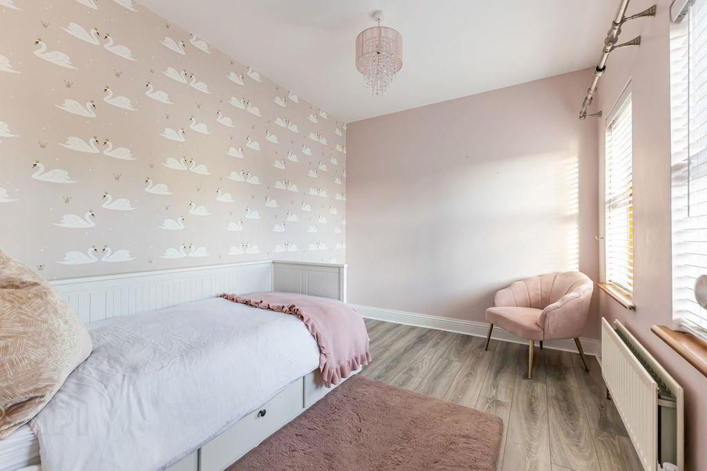 Single bedroom with 2 windows, wood effect flooring, double radiator and feature wallpaper.