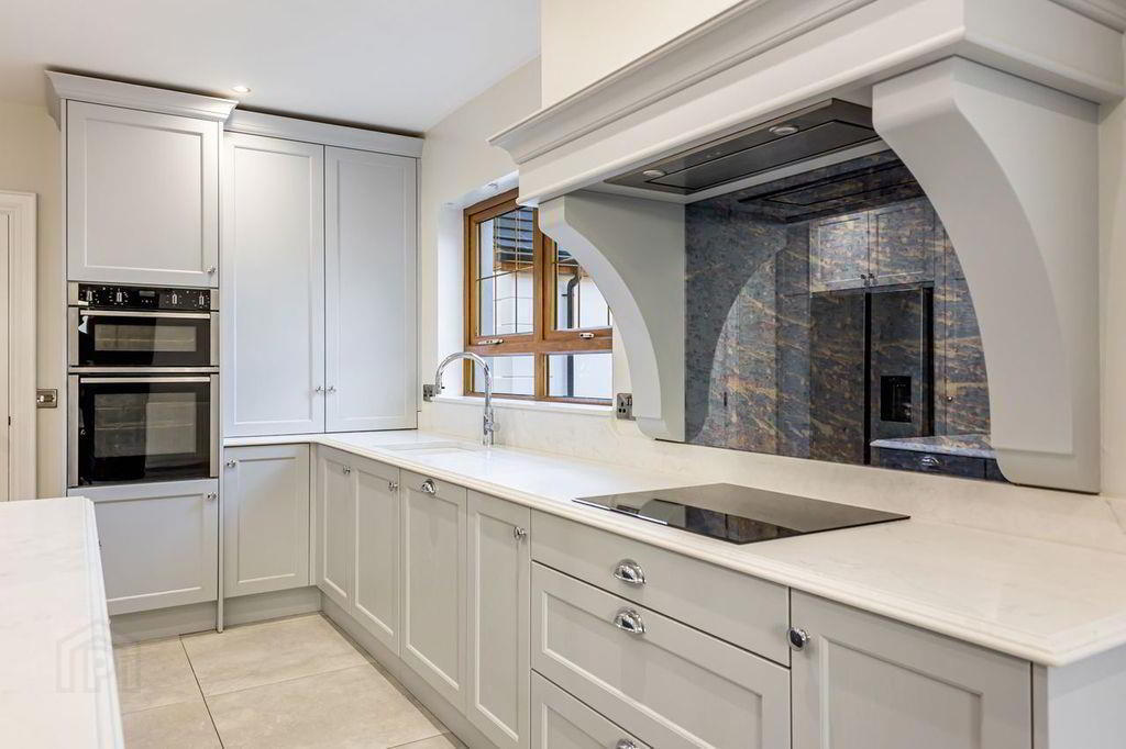 A selection of high and low level kitchen units with kitchen island in contrasting blue colour. Bulkhead feature above island with pendant lighting. Quartz worktops with bevelled edging. Quartz upstands and kitchen windowsill. Neff induction hob with smoked mirrored backsplash, overmantle and built in extractor fan. Double oven, integrated dishwasher, Quooker boiling water tap and American fridge freezer. Neutral tiled floor and double radiator.
