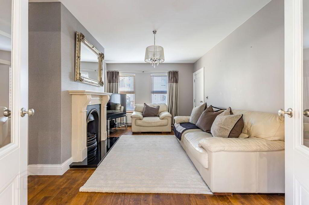 Bright room with double windows to the front and single window to the side. Wood effect floor, pendant and wall lighting, double radiator and feature wallpaper. TV mount on chimney brace.
