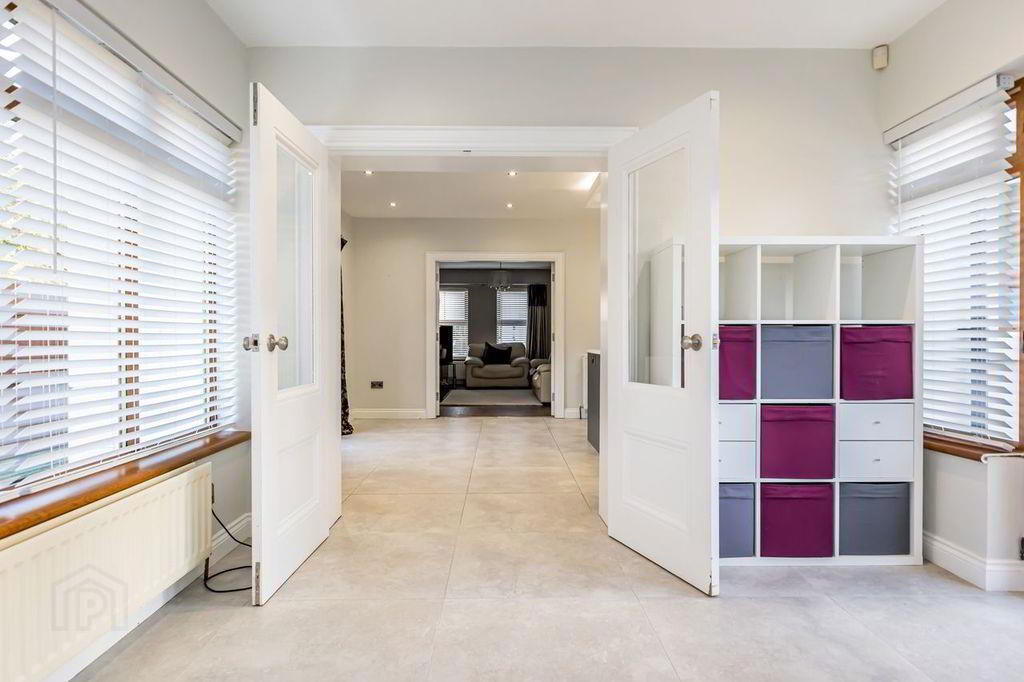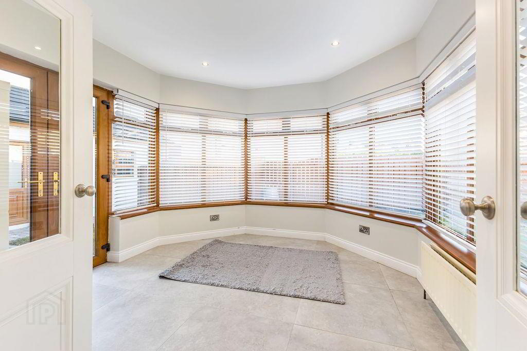 Hexagonal shaped sunroom with double glazed doors from kitchen/dining area and French patio doors leading to outside area. Neutral tiled floor continues in from kitchen area, spotlighting, horizontal blinds, double sockets and double radiator.