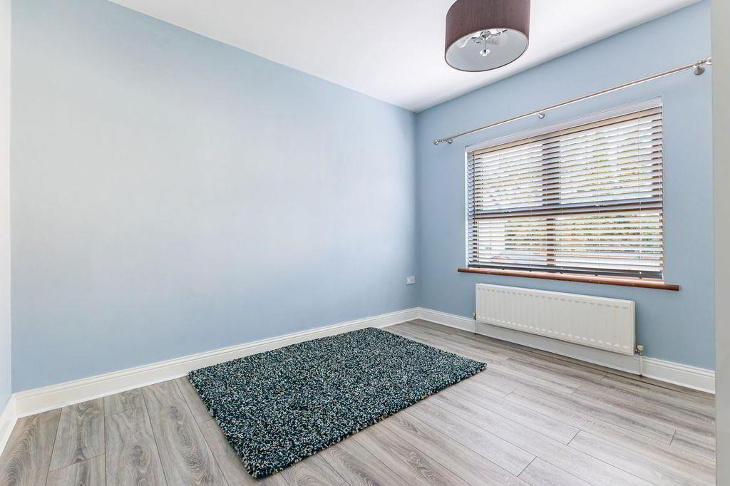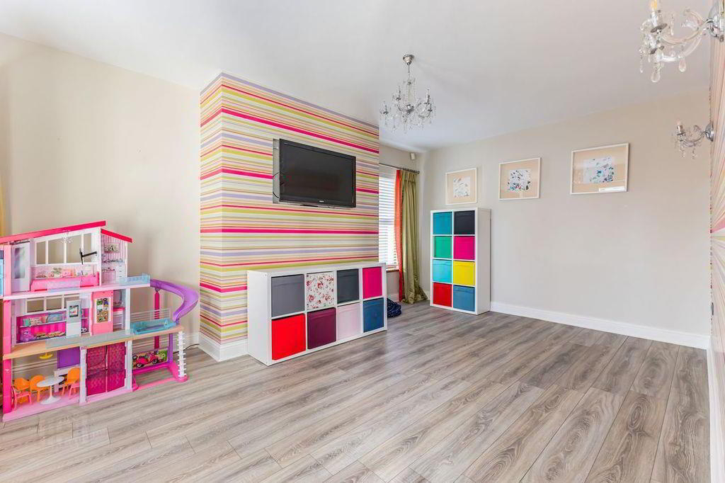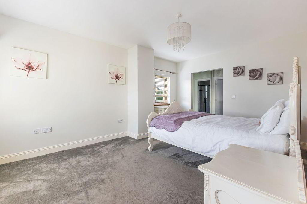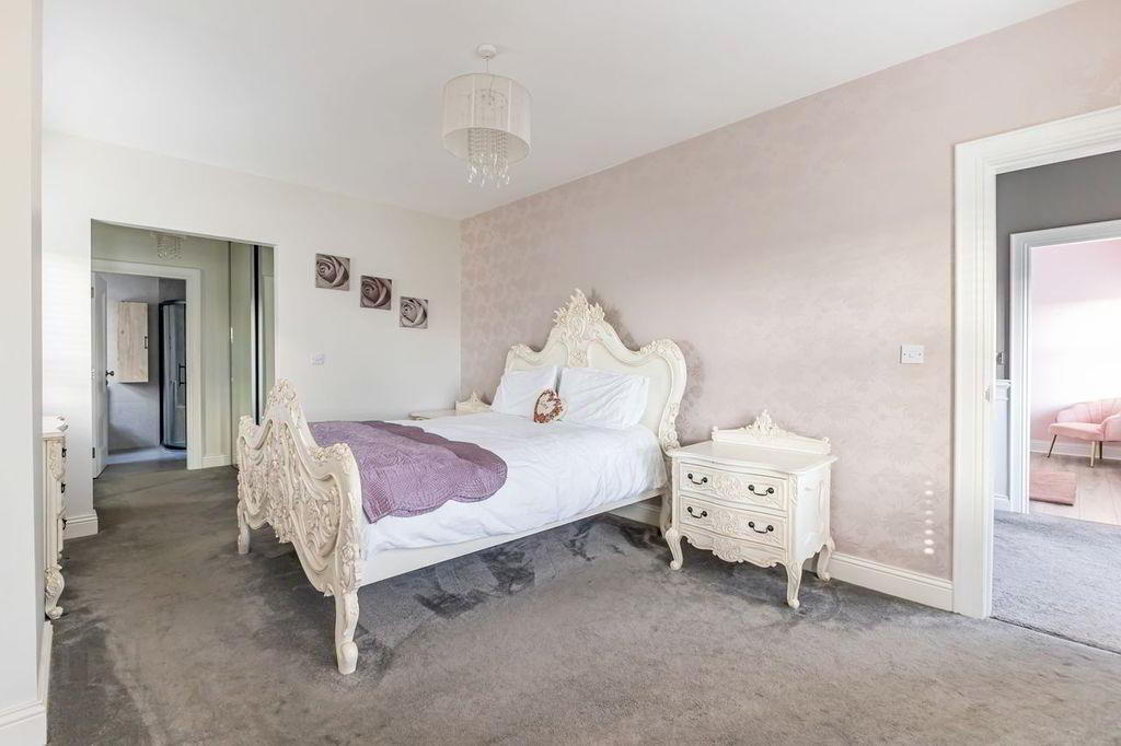 Large bright bedroom with double windows to front and single window to the side. Feature wallpaper. Dressing room off master suite with floor to ceiling mirrored sliding wardrobes. Neutral grey carpet. Double radiator.