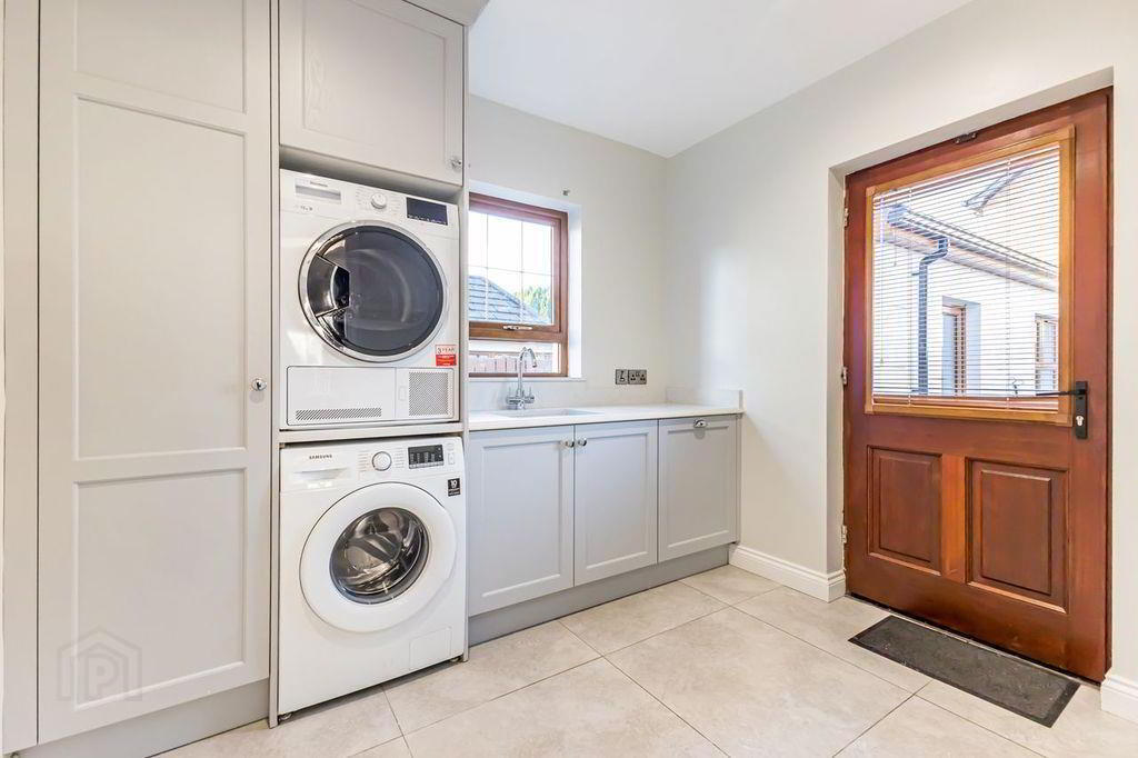 Back door entrance into utility room. A range of high and low level units to co-ordinate with the kitchen units and neutral tiled floor. Quartz worktop with bevelled edging, upstands and windowsill. Stacked washing machine and tumble drier, chrome mixer tap and integrated double bin. Single radiator.