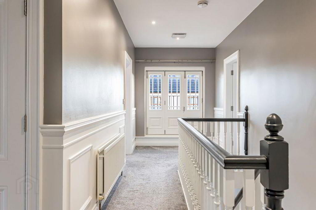 Bright landing area with feature door that leads to Juliet balcony. Painted staircase and white painted half panelling. Neutral grey carpet and double radiator. Large hotpress.