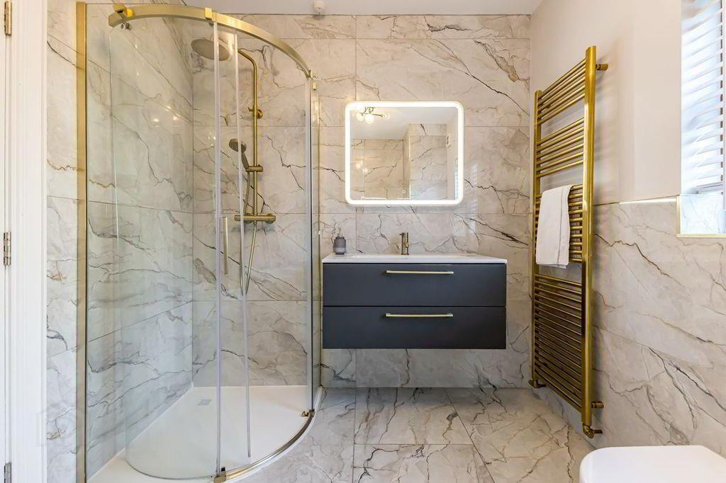 White WC and freestanding bath with shower attachment. Marble effect tiles floor to ceiling and on floor. Rainfall and handheld showerheads. Gold coloured sanitary fittings and heated towel rail. Illuminated over sink mirror. Under sink storage in contrasting navy colour.