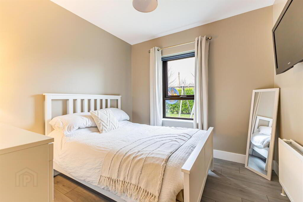 Wood laminate flooring with double radiator and TV mount. Mirrored sliding built in wardrobe.