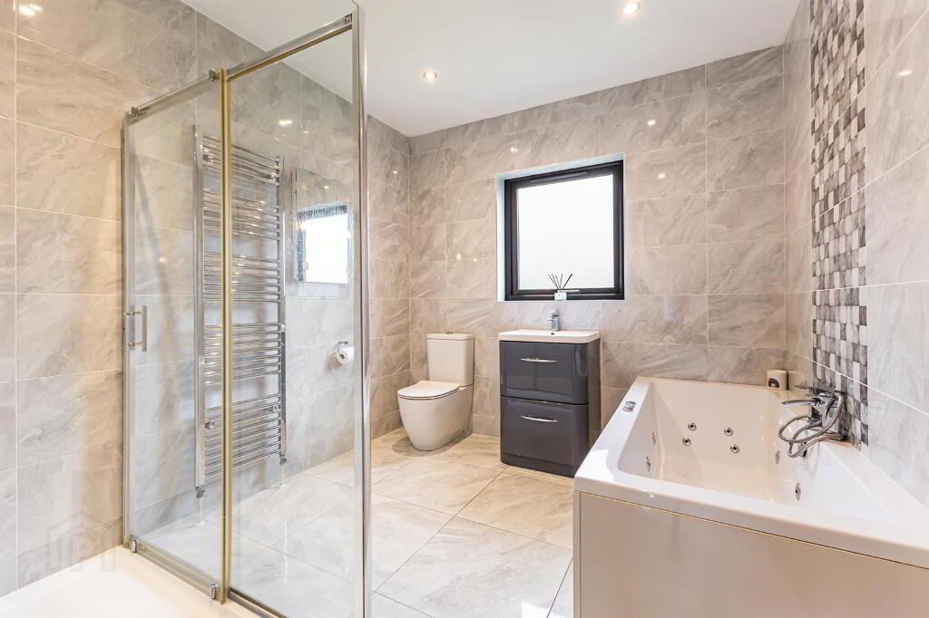 White sanitaryware, Floor to ceiling tiling. Heated chrome towel rail. Grey high gloss sink unit with drawer storage and chrome mixer tap. Wall mounted mirror. Electric shower enclosure, white whirlpool bath with grey feature tile and mixer tap with shower attachment.