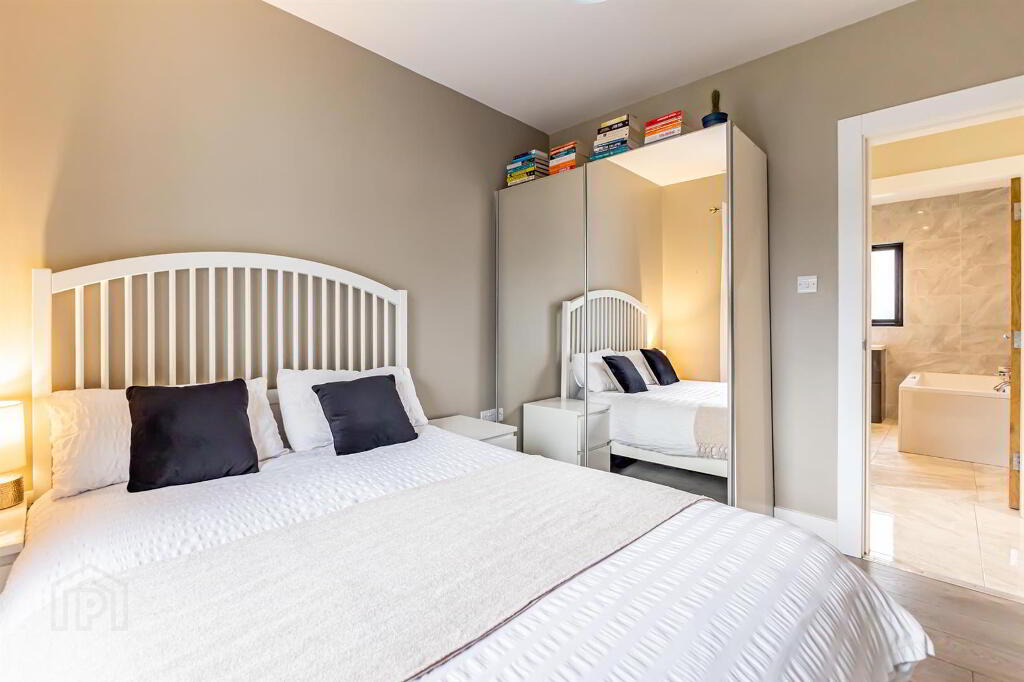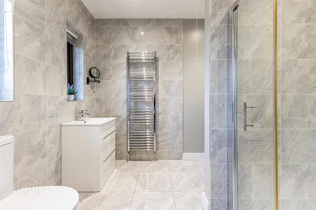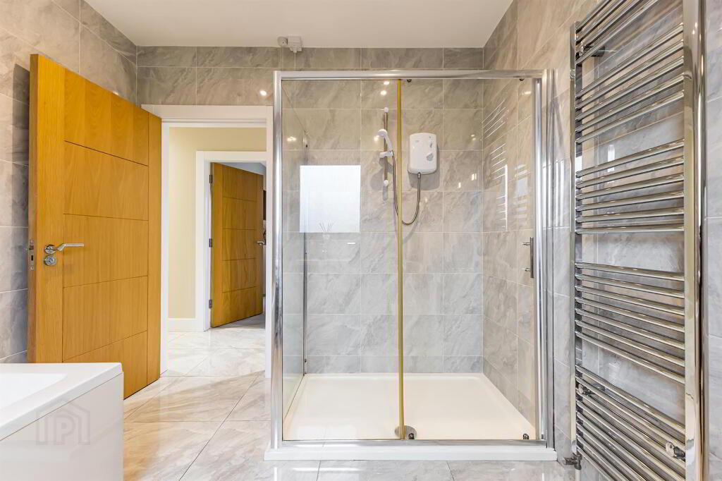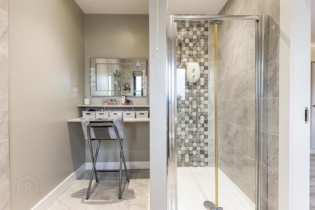 White sanitaryware, Floor to ceiling tiling. Heated chrome towel rail. White high gloss sink unit with drawer storage and chrome mixer tap. Wall mounted mirror. Electric shower enclosure with grey feature tile. Vanity area with Hollywood mirror.