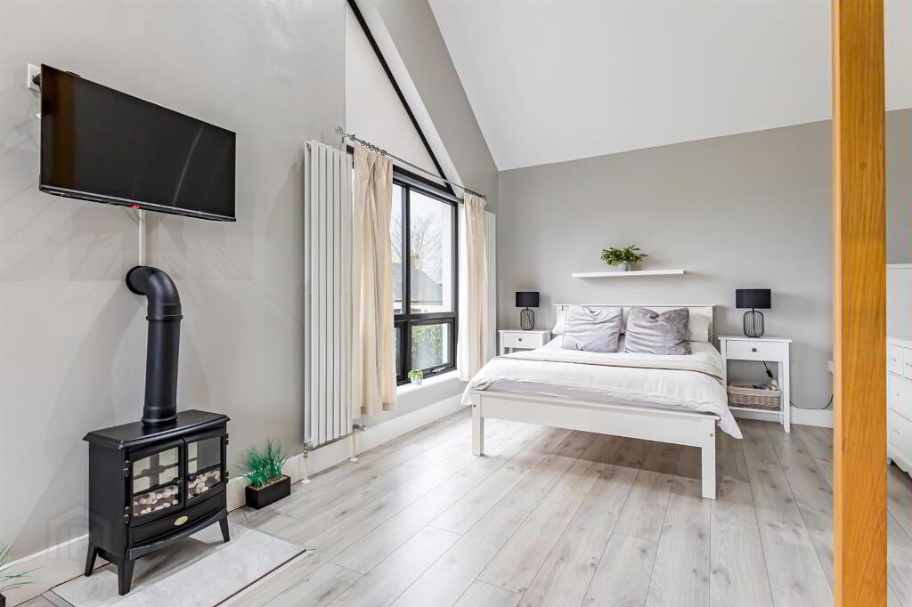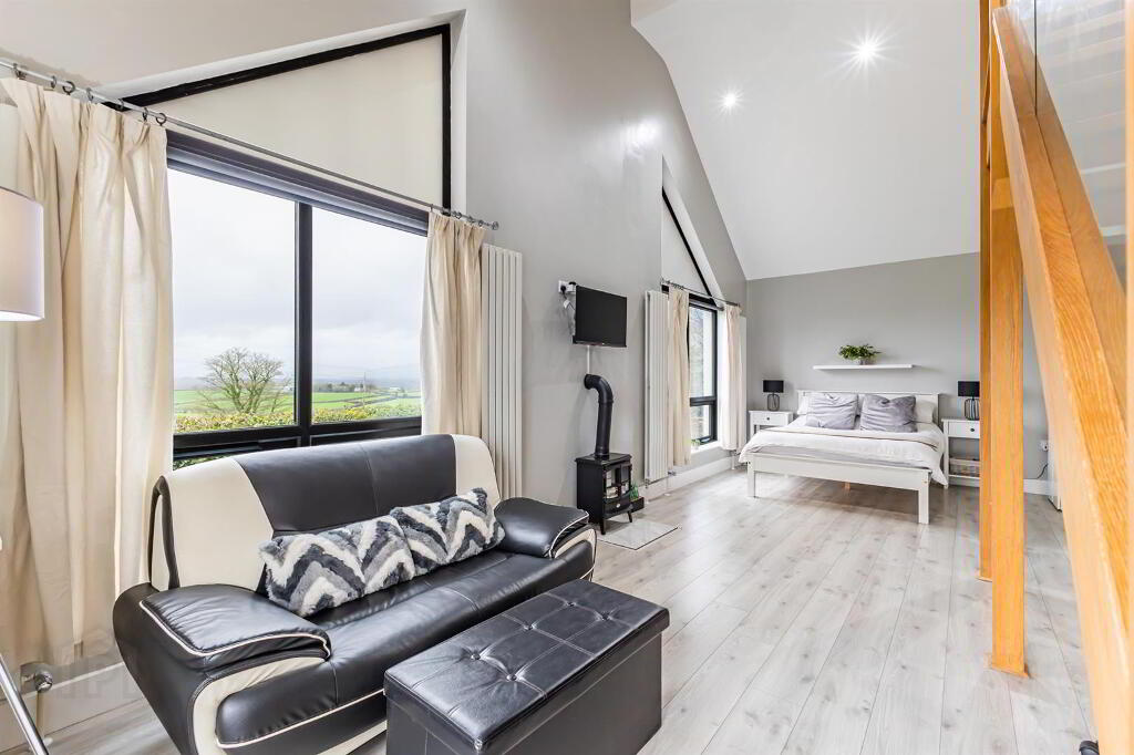Large bedroom suite with double height vaulted ceiling. Wood laminate flooring. 4 double vertical radiators and multi fuel stove. Living area and staircase to area above.