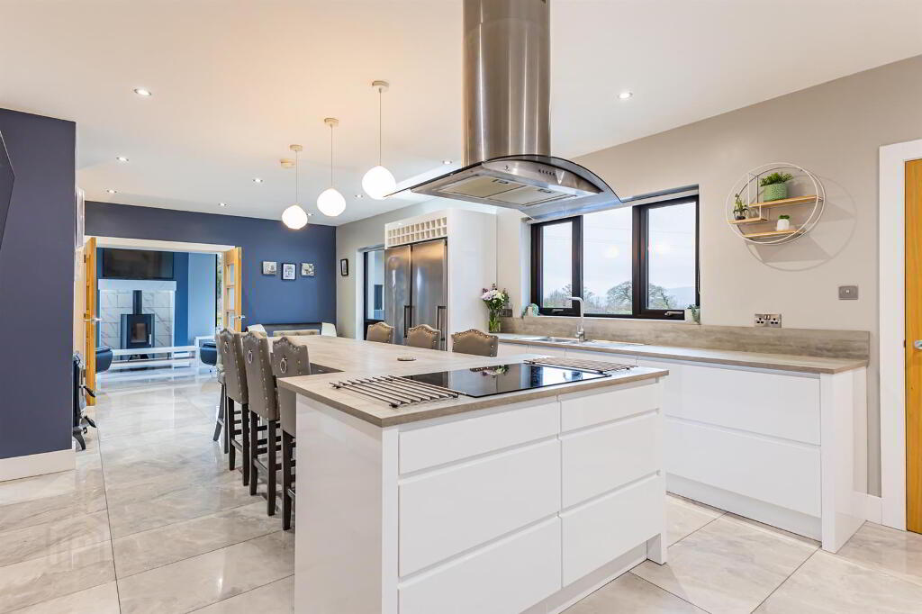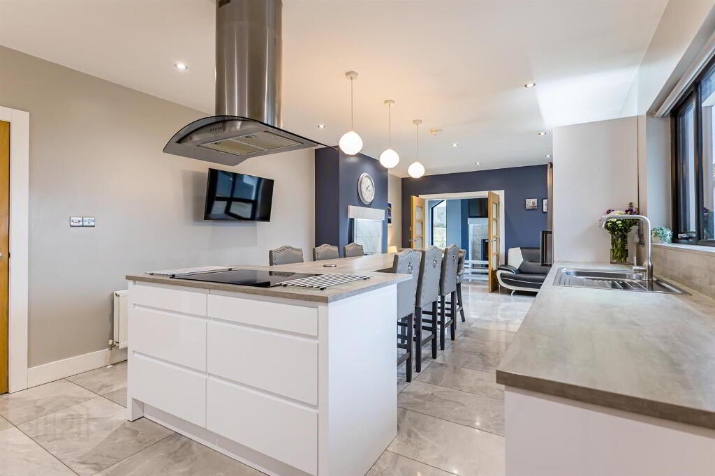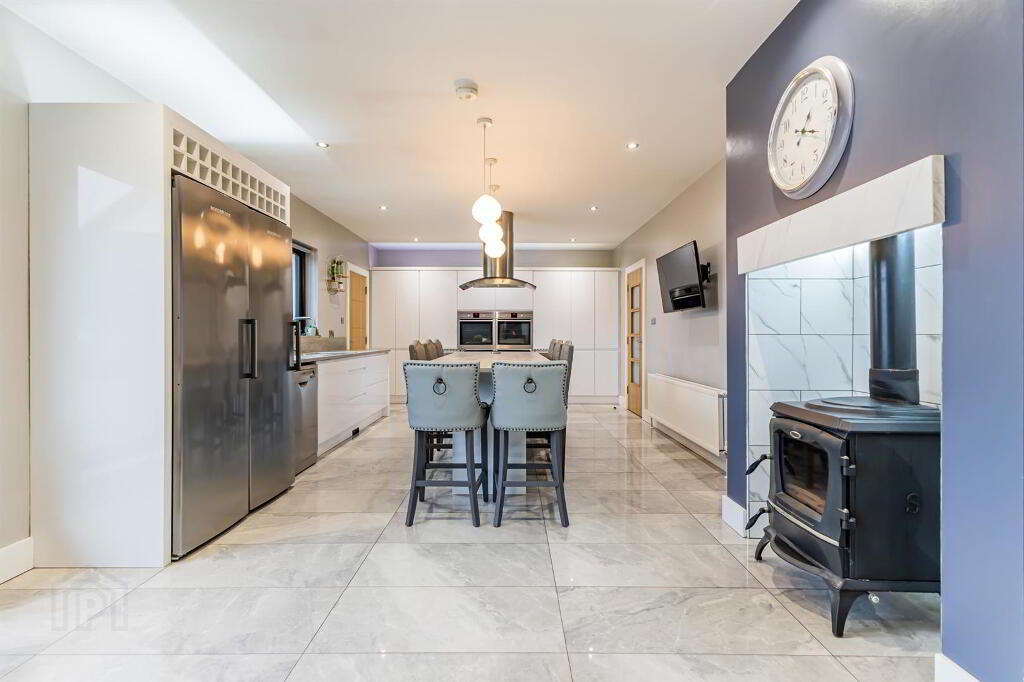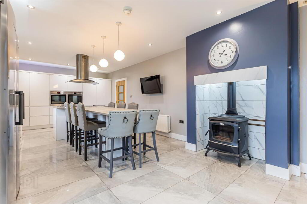 Range of high and low level white handleless units with high gloss tiled floor and spotlighting, Large kitchen island with pendant lighting over island and pop up integrated socket. Grey quartz worktops, upstand and kitchen windowsill. Double eye level ovens , induction hob, full size fridge and freezer, dishwasher, and stainless steel extractor fan over island. Winerack above fridge and freezer. Double radiator and wall mount for TV.