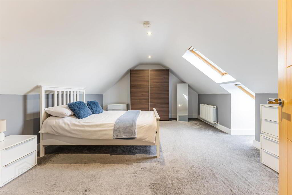 Large bedroom with grey carpeted floor, spotlighting, velux windows and double radiator.