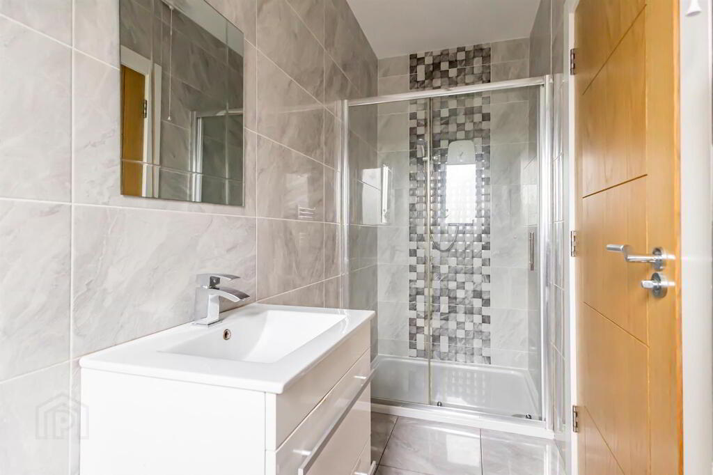 White sanitaryware, Floor to ceiling tiling. White high gloss sink unit with drawer storage and chrome mixer tap. Wall mounted mirror. Electric shower enclosure with grey feature tile.