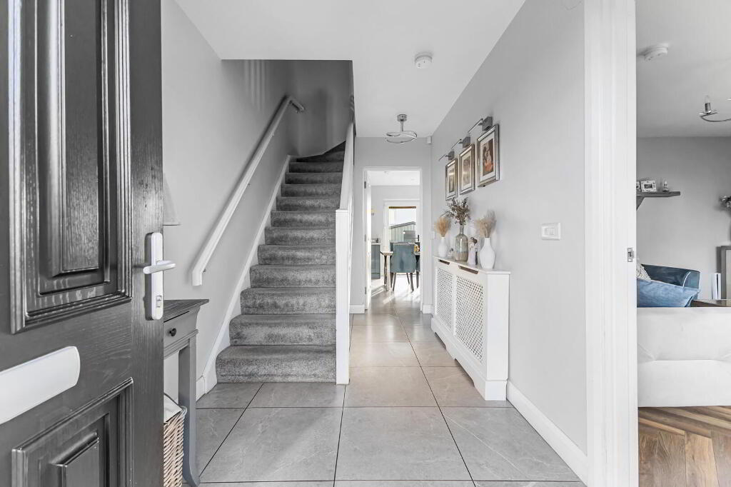 uPVC front door with glazed panel to side. Grey neutral floor tile. Grey carpet on white painted staircase.