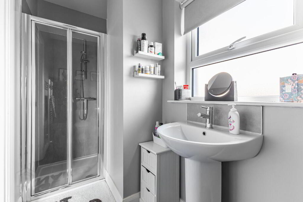 Off utility room and painted to co-ordinate with kitchen and utility room units. White sanitaryware and neutral tiled floor.