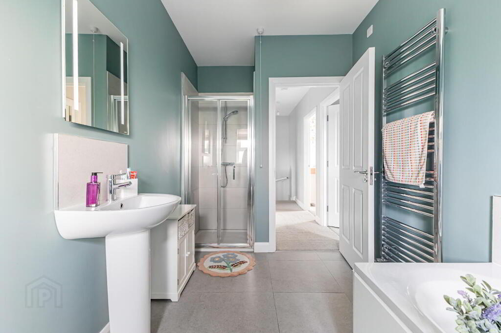White sanitaryware with pedestal sink, bath with chrome sanitary fittings. Tiled shower enclosure with chrome shower attachment. Chrome heated towel rail. Illuminated over sink mirror.