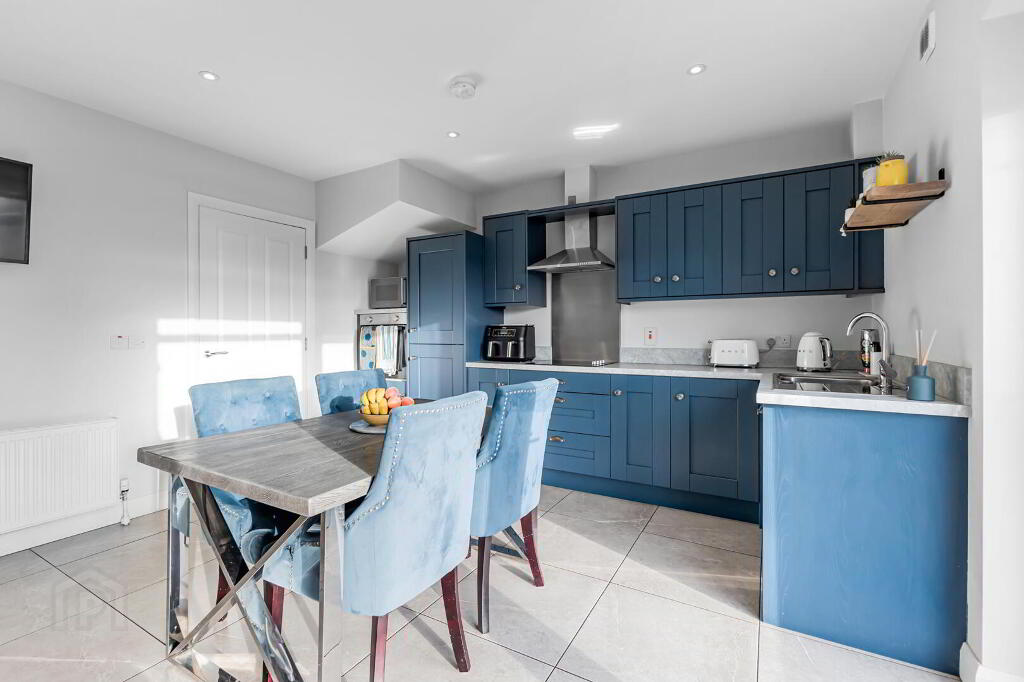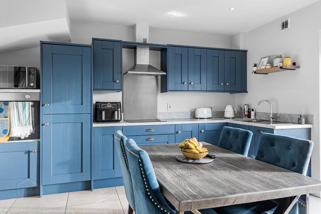 A range of high and low level shaker kitchen units in contemporary blue colour. Neutral worktops and upstands. Stainless steel Extractor hood and splashback. Integrated fridge freezer, oven and dishwasher. Induction hob. Venetian blinds fitted to the patio door leading to the back garden.