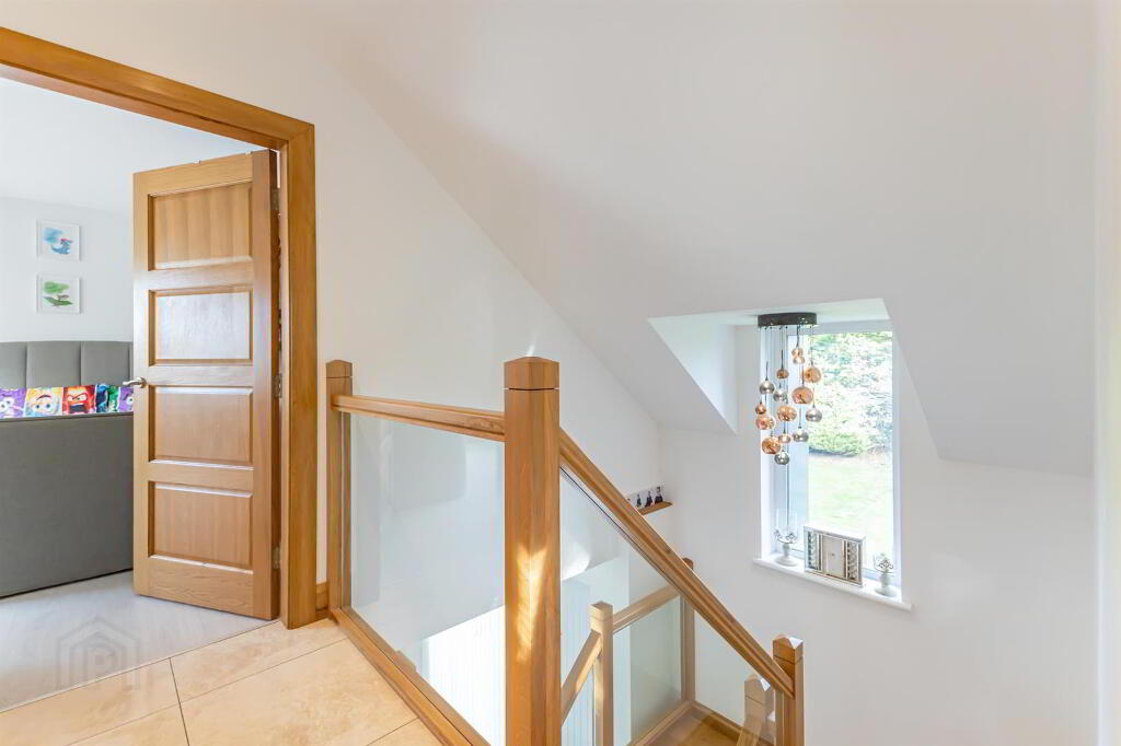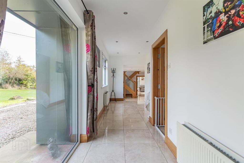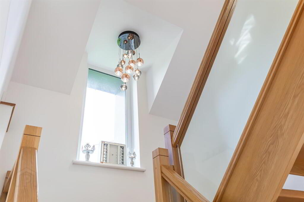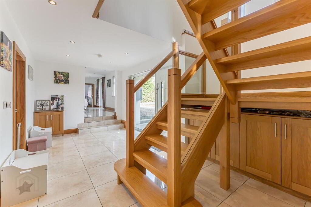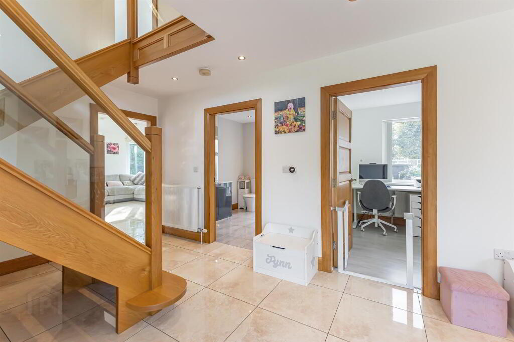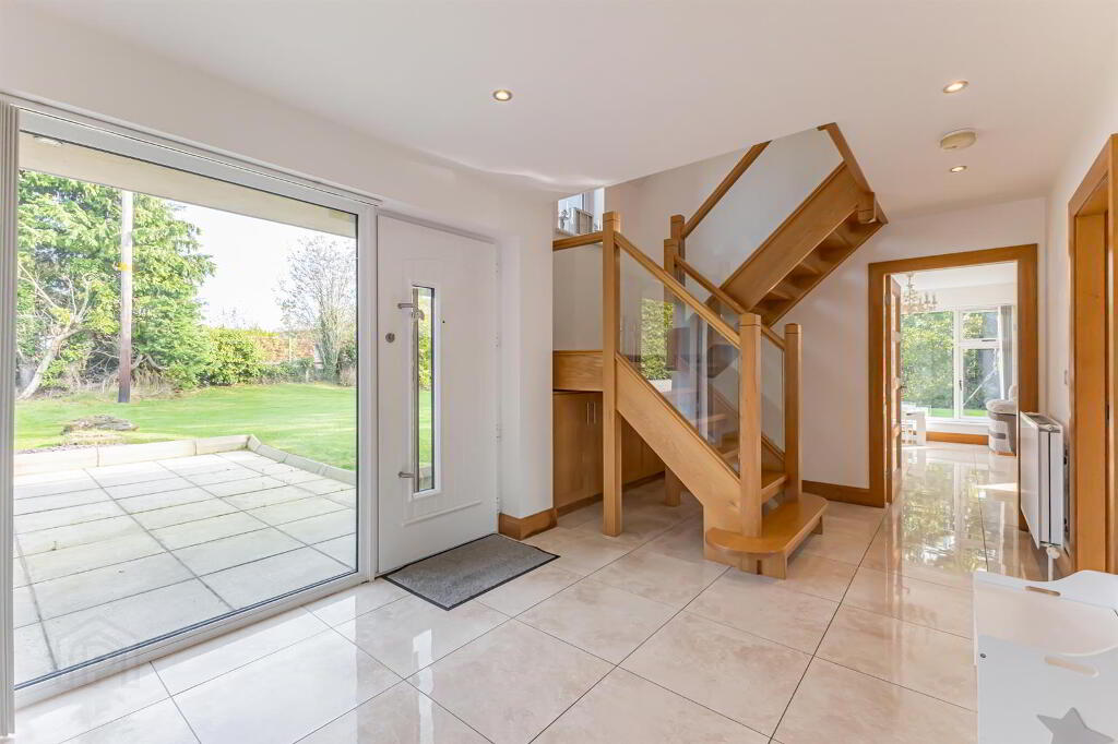 A bright, spacious, and modern area featuring a composite front door. The impeccable design includes tile flooring and leads to an elegant oak stairwell with a glass balustrade, creating a stylish and welcoming first impression. The large windows allow for the natural sunlight to shine through the hallway and create an open and bright atmosphere.