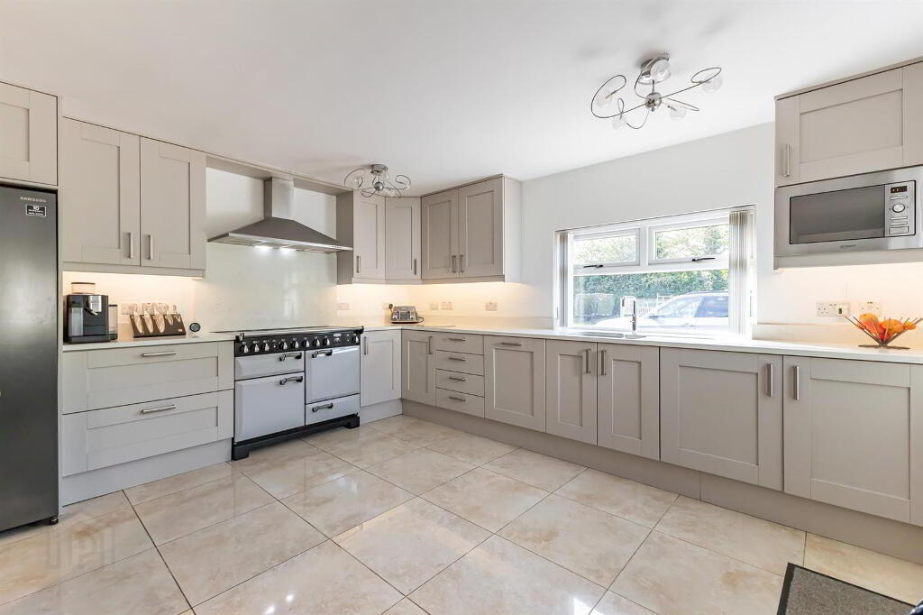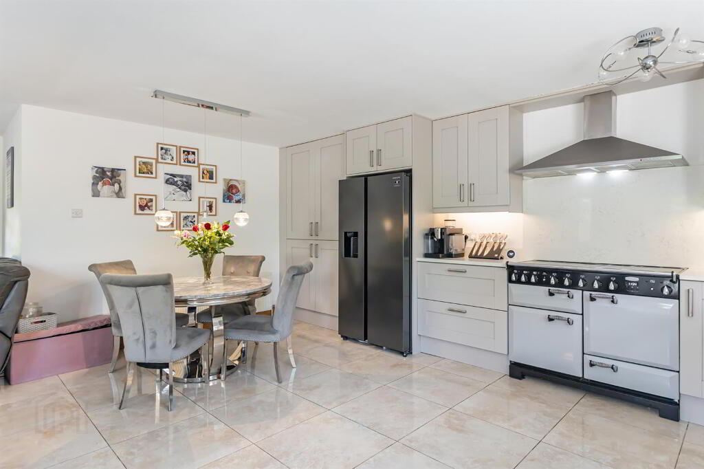 A high-specification kitchen with sleek tile flooring throughout, featuring modern high and low-rise units with a quartz worktop, including matching upstands and splashback. The kitchen is currently equipped with a Quooker hot water tap and a range of integrated appliances, including an Indesit dishwasher and a Rangemaster cooker. There are also provisions for an American fridge freezer and washing machine. This exceptional kitchen seamlessly flows into the open-plan living area, perfect for family living and entertaining.