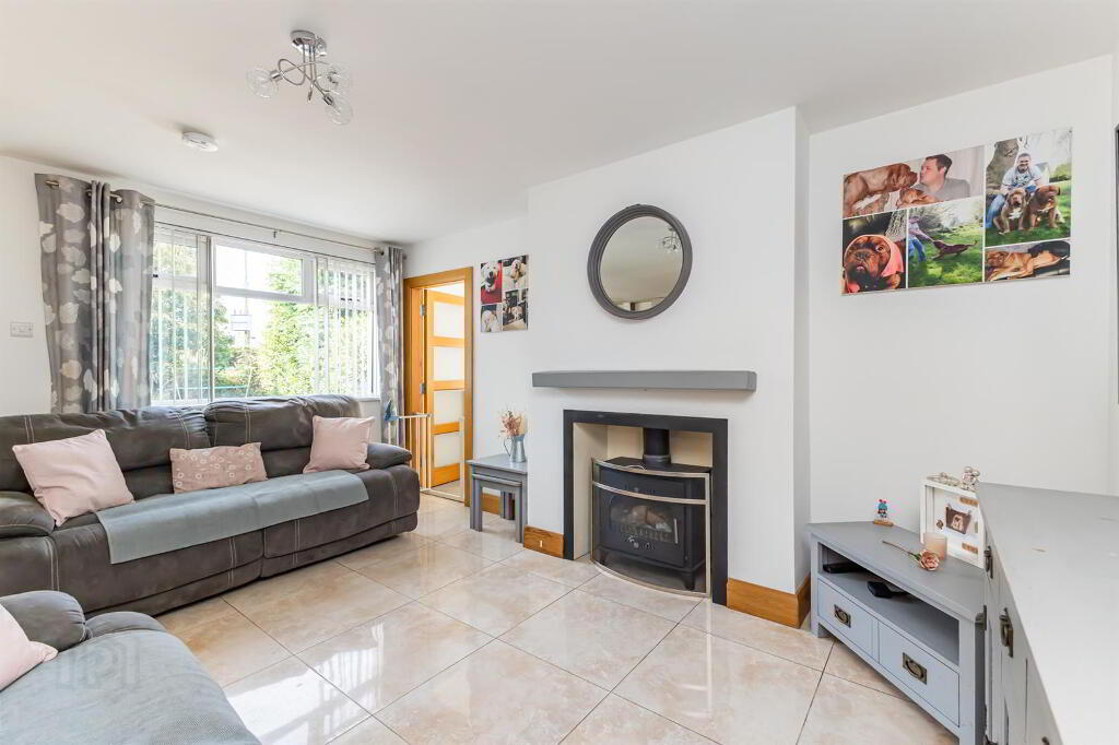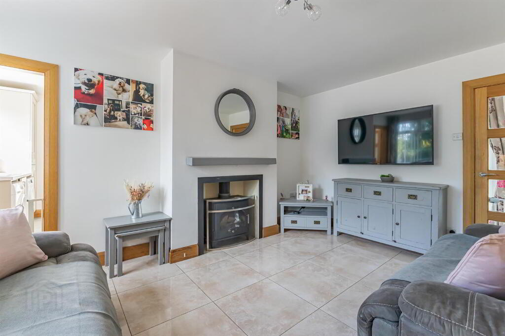 A comfortable and spacious reception area with open-plan access from the kitchen and dining area. It features tile flooring and a multi-fuel stove, perfect for relaxing and entertaining.